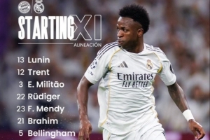 皇马首发:13-卢宁、12-阿诺德、3-米利唐、22-吕迪格、23-费兰·门迪、21-布拉欣·迪亚斯、5-贝林厄姆、8-巴尔韦德、15-居莱尔、10-姆巴佩、7-维尼修斯