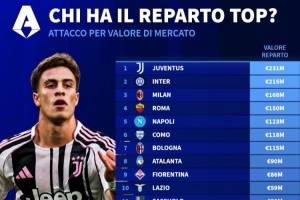体育资讯4月16日讯 德转按后卫+门将、中场、前锋统计意甲各队球员身价,前锋球员总身价中,尤文以2.31亿欧居首,国米第二,米兰第三。